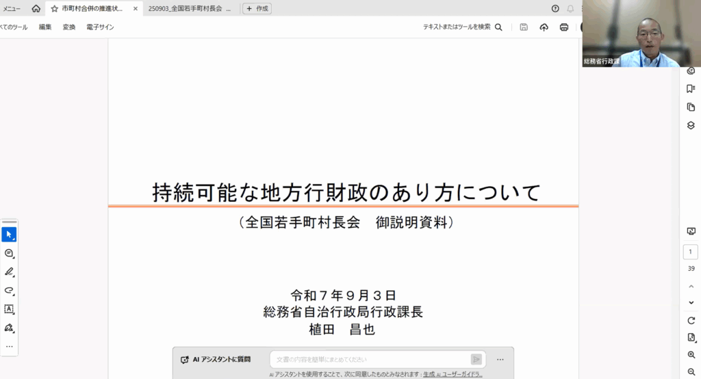 全国若手町村長会では、2025年9月3日に会員の町村長・職員を対象としたオンライン勉強会を開催しました。本会では地域課題解決や活性化に取り組むべく、若手町村長が集い本気でぶつかり研鑽を深めています。